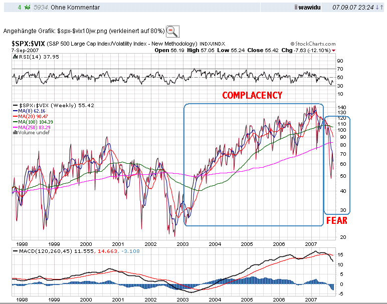 Übrigens wenn du schon weiter oben schöne Ratiocharts postest mit "Dow-Perspektiven" wäre es sicherlich für den ein oder anderen hier hilfreich wenn du den angehängten Chart mal aktuell zeigts wo du doch so auf die SPX/VIX Ratio schwörst.