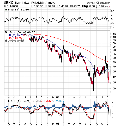 Jetzt weiß ich auch, welchen wichtigen Index ich nicht beachtet habe und weshalb mein Dow-long vor einigen Tagen Unsinn war: der $BKX. Unten ist der chart, absolut desaströs, da muß es ein gewaltiges neues Tief geben, allein schon wegen der Fallgeschwindigkeit.