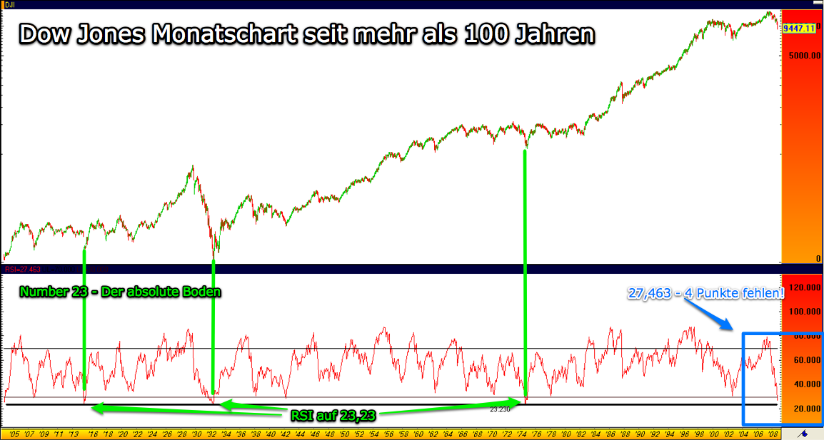 Der Monats-Chart ist vom Mittwoch und aktuell steht der RSI(14) schon bei 23,52 bezogen auf einen Dow von 8451