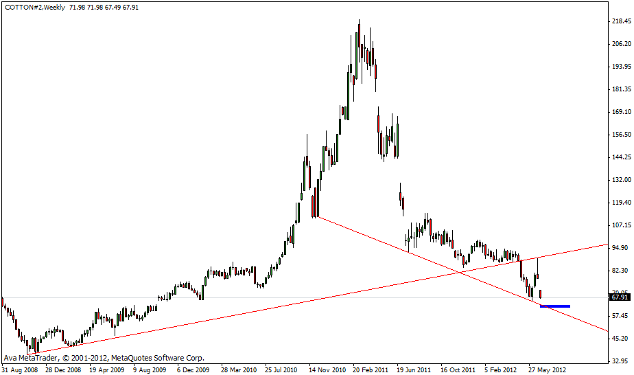 abwärts nicht. Baumwolle befindet sich, langfristig gesehen, in einer Seitwärtsbewegung, nach einer langfristigen Abwärtsbewegung. Dies könnte auf langfristige Bodenbildung hindeuten und vielleicht bald wieder für die Bullen interessant werden lassen.