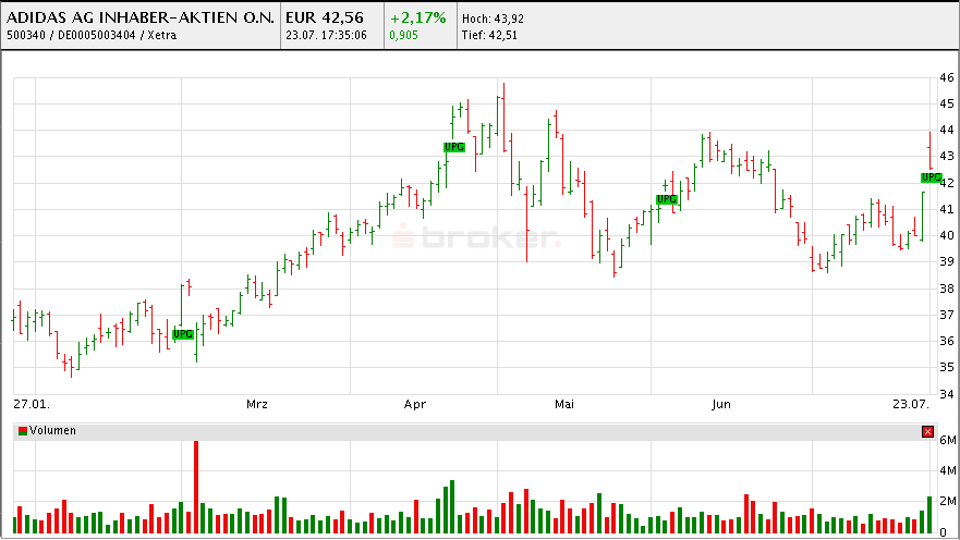 Man kann natürlich die Eröffnung am Montag abwarten und Short gehen, wenn der Kurs unterhalb des Schlusskur­ses geht. Garantien gibt es keine. Die letzten Up Gaps wurden bei Adidas entweder direkt, oder nach kurzer Zeit geschlosse­n(Nachfolg­ender Chart).