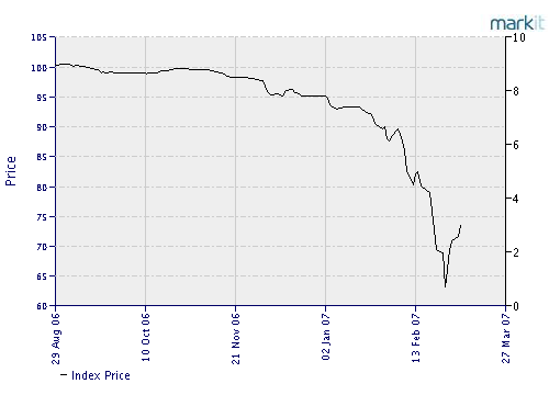 So wie der Itraxx eine Risikoabsicherung gegenüber Junk-Bonds ermöglicht, so erlaubt der "ABX BBB-"-Index eine Absicherung gegenüber Junk-Hypotheken. ("BBB-" ist der Code, den Ratingagenturen für Junk-Bonds vergeben.) Es sollte nicht überraschen, dass der ABX BBB- in den letzten Wochen eine rasante Talfahrt hinter sich gebracht hat. Der Index fiel von einem Wert von 95 auf 60 im Februar. Das heißt, die Risikoabsicherung wurde erheblich teurer. Mittlerweile greift aber die Unsicherheit auch auf die besseren Hypotheken über, bei denen es bislang noch keine konkreten Probleme gab. Aber auch dort entwickeln Investoren wieder eine natürliche Angst vor dem Risiko.