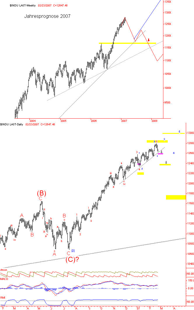 Die letzte größere Analyse für den Dow liegt inzwischen fast zwei Monate zurück. Damals wurde eine kurze Korrektur im Januar und anschließend Gewinne bis 12.800+ prognostiziert. Dieser Anstieg sollte zugleich die Endphase der Hausse sein, die seit Juni 2006 läuft.