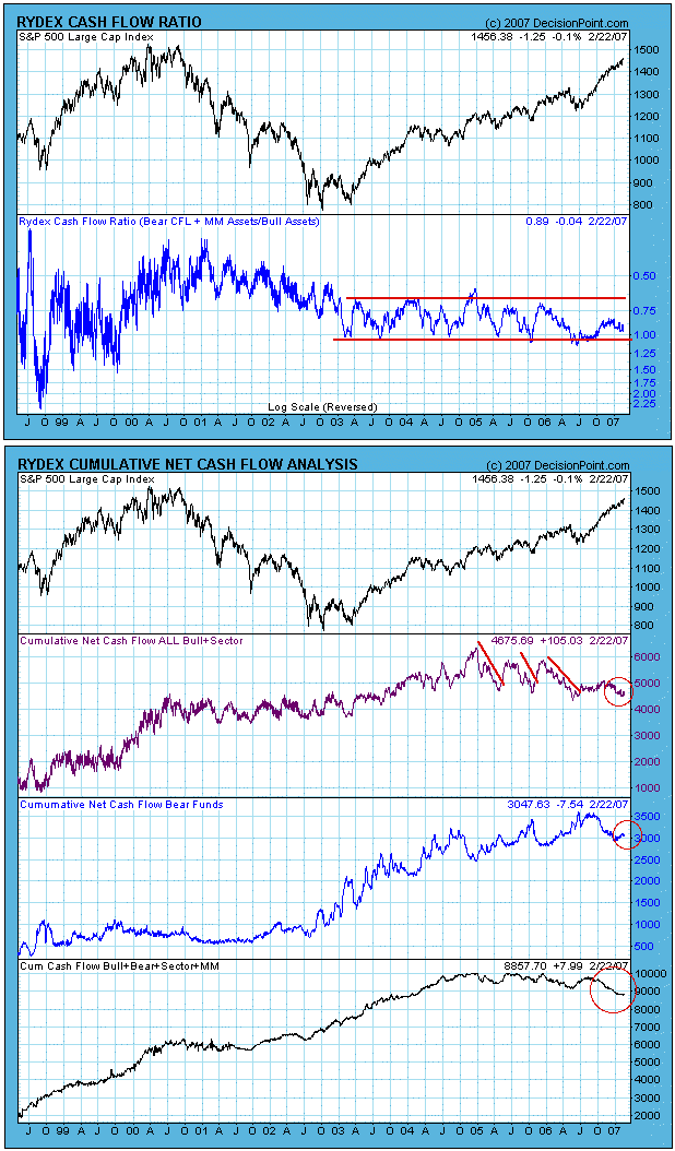 The first real evidence we have of Rydex bull funds being abandoned for ETFs is the period following the June/July 2006 lows. Note the absence of an upward surge in bullish cash flow associated with the rally. Last week I concluded that this was evidence of a "wall of worry", and that the bulls had not yet accepted the rally. I now believe that conclusion was wrong, and that investors are shunning Rydex bull funds in favor of ETFs. I think this conclusion is borne out by the bottom panel on the chart which shows total cash flow beginning to trend downward.
