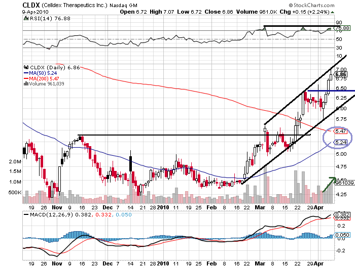 Dr. Aschoff: There is Celldex (CLDX) and Keryx (KERX). Celldex is a company with several cancer vaccines as well as antibodies for cancer. It's fully an oncology company; they are going to have a lot to show at this year's ASCO, and the stock has done remarkably well into the last two ASCO conferences due to positive Phase II data from CDX-110 in glioblastoma. This is about a $5 stock that hit $20 into the 2008 ASCO, $14 at last ASCO, and I'm looking for at least a double from here into ASCO 2010, when they show their best cancer results generated between last year's ASCO and the current. Buying CuraGen was a useful acquisition, mostly for the cash it had but also for one Phase II antibody for breast cancer, and there's also a whole bunch of pre-clinical antibodies. And maybe they will develop some, but more likely and hopefully they'll try to partner some because their clinical plate is rather full at present with CDX-1307, CDX-011 and CDX-1401.