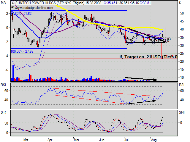 Die gute Positionierung und der Silizium-Impulse sind Faktoren, die sich im Kurs noch nicht widerspiegeln: Suntech ist niedriger als die Peergroup bewertet. Die Chancen stehen daher bestens, dass die Aktie den charttechnischen Seitwärtstrend zügig in Richtung Sonne verlässt.