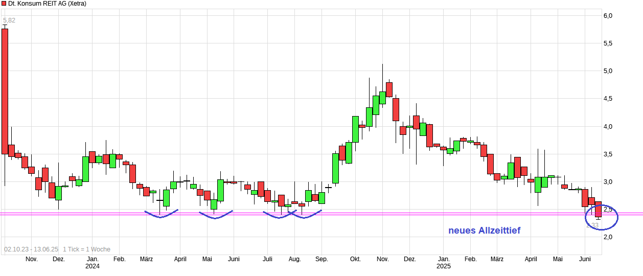 Deutsche Konsum REIT droht Verlust des REIT-Status - hohe Abschreibungen nötig -22.07.2025 - https://www.4investors.de/nachrichten/...?sektion=stock&ID=184836 "....Die Deutsche Konsum REIT-AG rechnet für das dritte Quartal ihres laufenden Geschäftsjahres mit einem Abwertungsbedarf in Höhe von rund 41 Millionen Euro. Hintergrund ist eine neue Bewertung des Immobilienportfolios, das zum 30. Juni 2025 bei etwa 794 Millionen Euro liegt. Das entspricht einem Rückgang von 4,9 Prozent gegenüber dem Stand vom 30. September 2024. Mit dieser Entwicklung wird die Deutsche Konsum REIT-AG die im REIT-Gesetz vorgeschriebene Eigenkapitalquote von mindestens 45 Prozent voraussichtlich auch zum Geschäftsjahresende am 30. September 2025 nicht erreichen. Infolge dessen dürfte die Gesellschaft ihren Status als steuerbefreiter REIT verlieren. Die Deutsche Konsum REIT-AG führt nach eigenen Angaben weiterhin Gespräche mit Gläubigern zur Umsetzung einer geplanten Sanierung. Diese sieht unter anderem Immobilienverkäufe in Höhe von bis zu 350 Millionen Euro bis Ende 2027 vor. Man wolle die Verhandlungen bis Ende August 2025 abschließen.