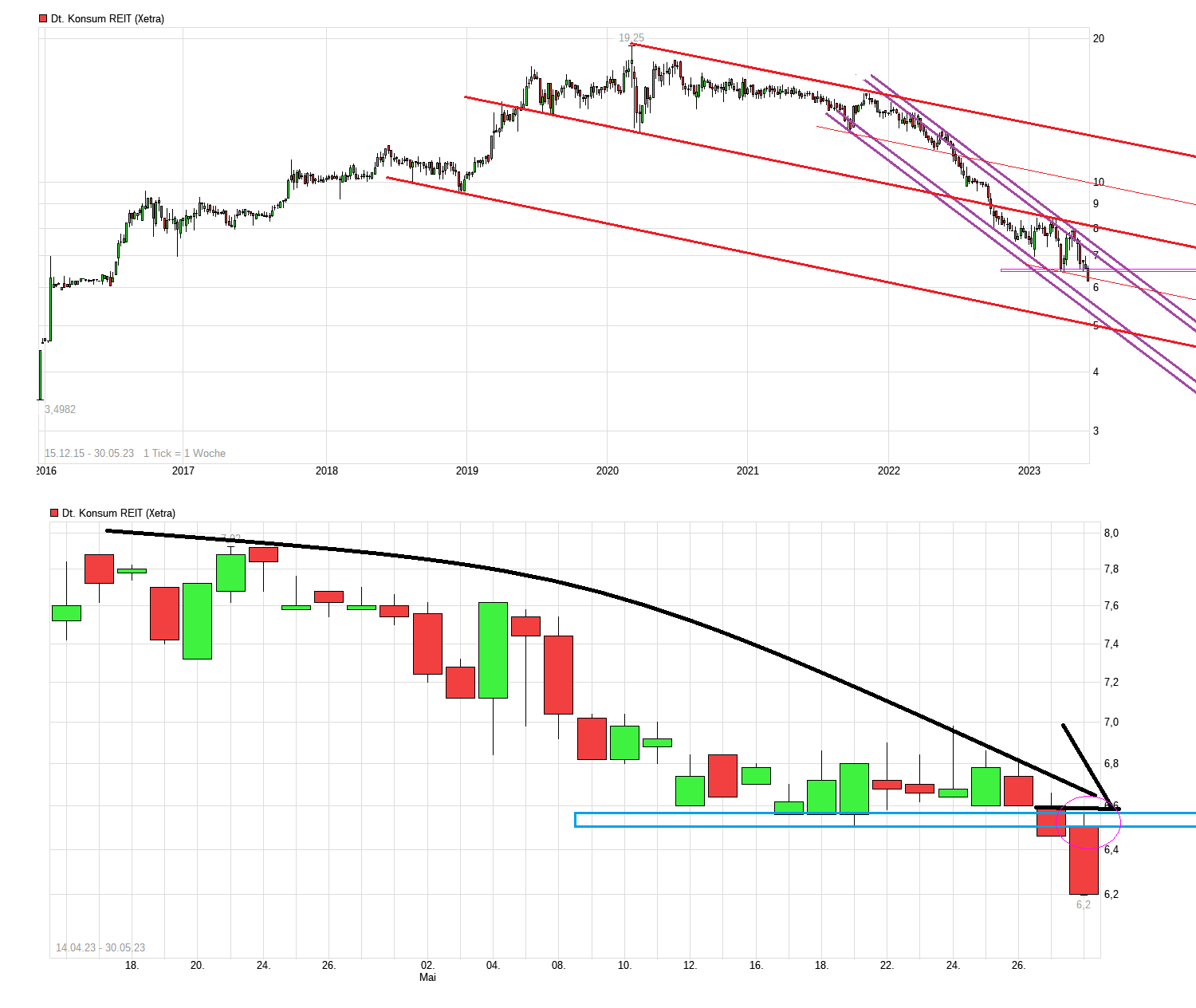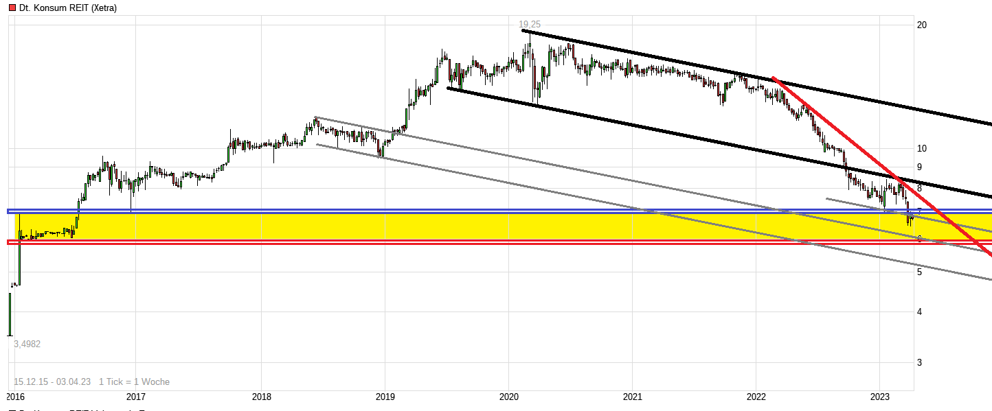 Artikel von Ende Februar 2023: https://www.boersengefluester.de/...-reit-ag-dividenden-hit-fur-marz/ "....„Wir arbeiten an einer Lösung“, sagt Rolf Elgeti, CEO der Deutschen Konsum REIT-AG bei seiner Präsentation auf den von Montega sowie Donner & Reuschel organisierten Hamburger Investorentagen (HIT) im Februar. Gemeint sind die beiden noch bis 2025 laufenden Wandelanleihen, die das auf Supermarkt- und Einkaufscenter-Immobilien spezialisierte Unternehmen vor vielen Jahren emittiert hat. Aus damaliger Sicht eine prima Starthilfe, aus heutiger Sicht eine absehbare massive Verwässerung der Aktienzahl um deutlich mehr als 40 Prozent, da der Wandlungspreis für beide Bonds extrem niedrig ist. Das drückt seit vielen Monaten auf die Notiz der Deutsche Konsum REIT-AG (DKR). Dem Vernehmen nach soll das Thema idealerweise noch im laufenden Geschäftsjahr geklärt werden, doch in seiner typischen Art räumt Elgeti auch ein, dass ihm diesbezüglich bislang „noch nichts Cleveres eingefallen ist“.