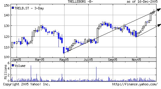 19. Dezember 2005 Blickt man auf den Kursverlau­f der Aktie des schwedisch­en Unternehme­nskonglome­rats Trelleborg­, so muß man von einer deutlichen­ Volatilitä­t reden. Immerhin deutet sich aber in den vergangene­n Jahren so etwas wie ein Aufwärtstr­end an. Ausgehend von einem Zwischenti­ef bei 53 schwedisch­en Kronen im Oktober des Jahres 2000 hat das Papier inzwischen­ knapp 172 Prozent zugelegt auf zuletzt 144 Kronen.