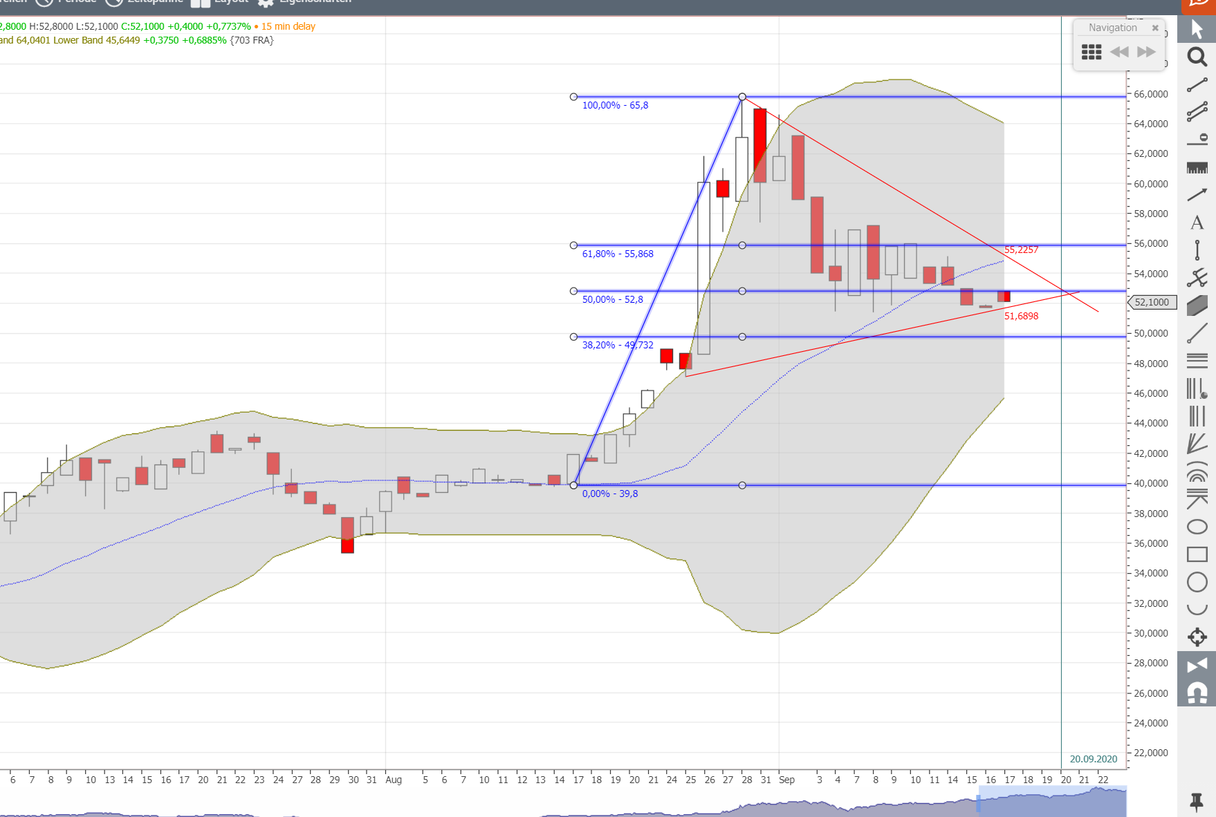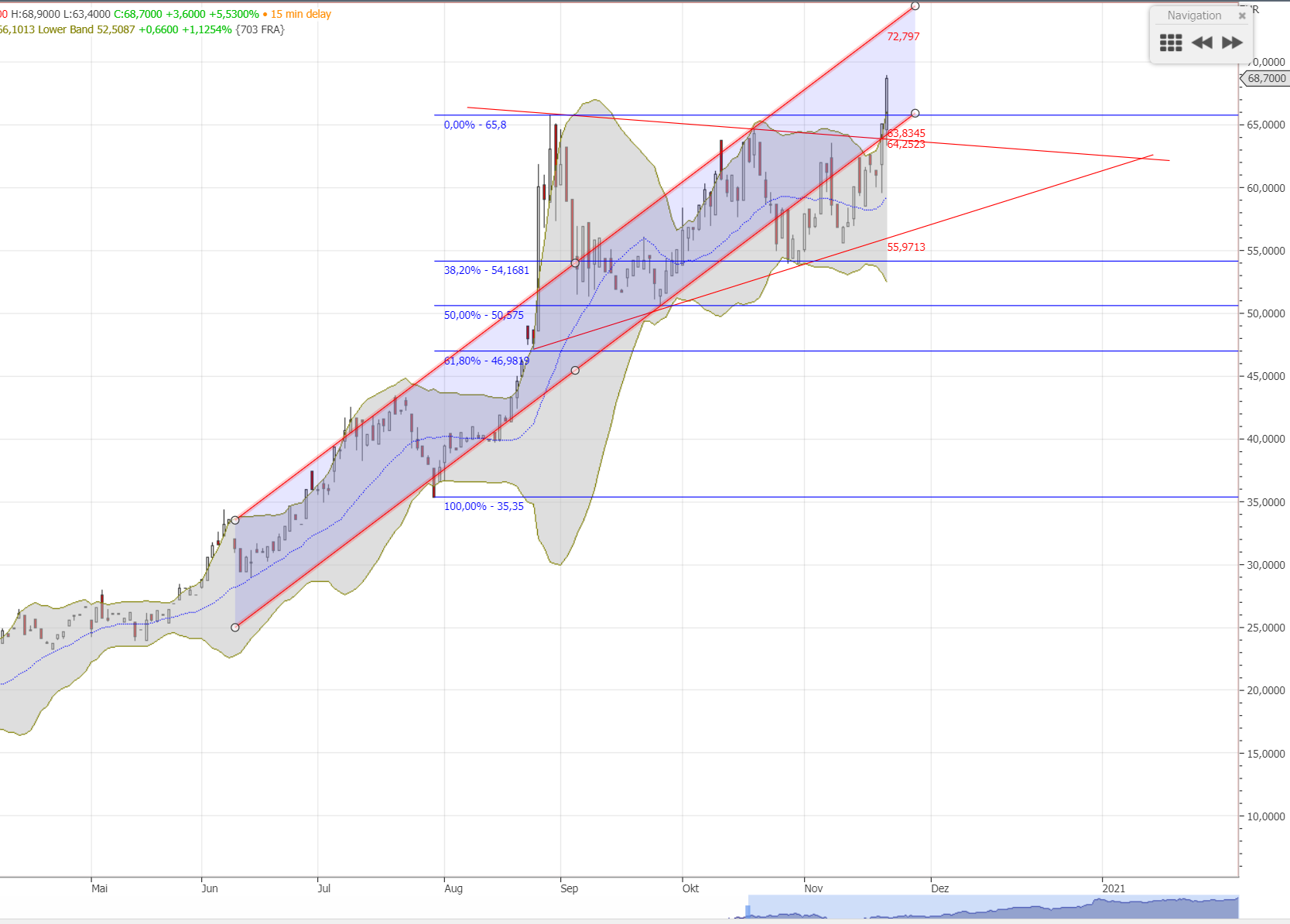 die midlane und 61,8-Retracemant liegen nah beieinander, wenn der Kurs darüber geht, öffnet sich eine Unterstützung bis 60-61 €. Hoffentlich kann die Aktie lesen, damit sie weiß, wo sie schon soll.