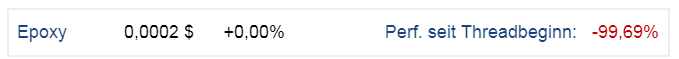 nach -99% kommt bei dem künstlich gehypten und dilutierten Pennystock Epoxy, nur noch ein Deckel druff... weiteres zukaufen verbietet sich schon nach dem Grundsatz, "schlechtem Geld kein gutes hinterherzuwerfen" und den Schaden so unnötig zu mehren...