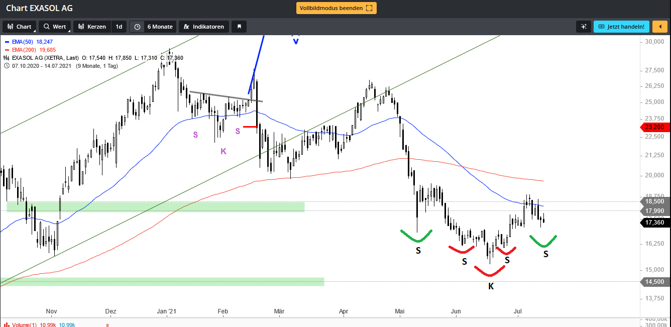 Sollten die Kurse nun nach Norden anziehen, entsteht eine zweite übergeordnete große s-k-s Formation (grün), und es könnte der endgültige Boden gewesen sein.
