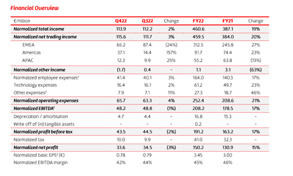 Flow Traders verzeichnete in Q123 einen normalisierten Gesamtertrag von 111,6 Mio. €, der sich aus einem normalisierten NTI von 110,4 Mio. € zusammensetzt, der ein anhaltend aktives Handelsumfeld widerspiegelt, und einem normalisierten sonstigen Ertrag von 1,2 Mio. €, der aus dem strategischen Anlageportfolio des Unternehmens stammt.