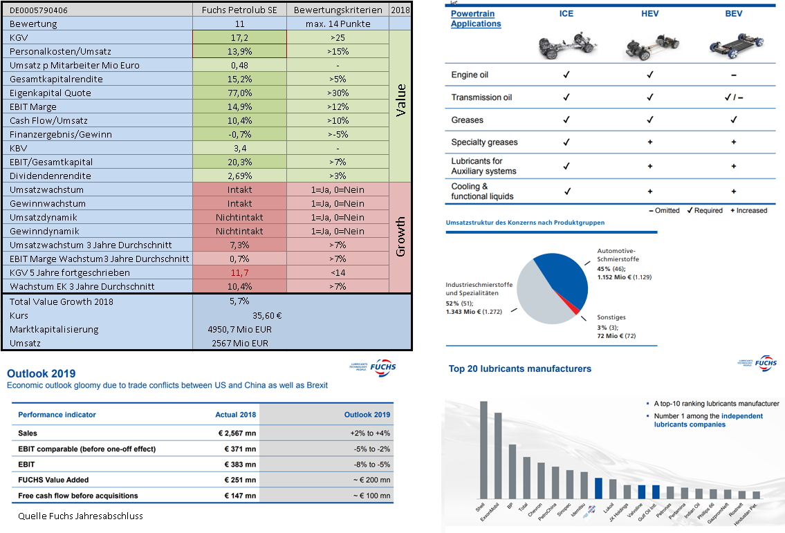 Für 2019 gibt Fuchs einen relativ zurückhaltenden Ausblick. Der Umsatz soll zwischen 2 und 4 % wachsen, beim EBIT erwartet mal sogar einen leichten Rückgang wegen bevorstehender Investitionen in Fabriken, Personal, Entwicklung und IT-Infrastruktur. Das gerade IT- und Personalkosten in Deutschland die letzten Jahre stark gestiegen sind, trägt hier sicherlich mit dazu bei.