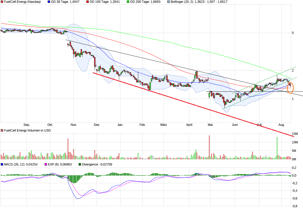 der grüne steile trendkanal wurde nach unten verlassen (bei 1,60$), das war einfach zu erkennen und man konnte gut nach ct handeln. wie gehts weiter? das bollinger band hat den kurs erstmal im bereich von ca.1,40$ aufgefangen. hier könnte der kurs nochmal einen versuch starten gegen den langfristigen trend und gegen die 200er anzugehen. falls der kurs keinen halt findet im bereich bei 1,40$ ist im bereich von 1,20$-1,15$ eine weitere unterstützung (dort wo die schwarzen linien verlaufen). im moment ist fcell nur für kurzfristige trader interessant. erst oberhalb von 2$ dreht der trend auch langfristig.