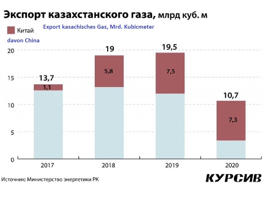 Im Jahr 2021 wurden aufgrund der Pandemie und unzureichender Exportproduktion 6,6 Milliarden Kubikmeter kasachisches Gas nach China exportiert, aber der 2018 unterzeichnete Vertrag sieht eine Steigerung der Exporte von 5 auf 10 Milliarden Kubikmeter pro Jahr für 2019-2023 vor. Dementsprechend wird Kasachstan in den nächsten zwei Jahren den "Mangel" von 2020-2021 ausgleichen, was meiner Meinung nach die Probleme des heimischen Kraftstoffmarktes weiter verschärfen wird. Die Exporte nach China machen etwa 20 % der nationalen Gasproduktion aus, was eine ziemlich hohe Messlatte für die inländische Gasversorgung einschließlich der Verarbeitung darstellt......