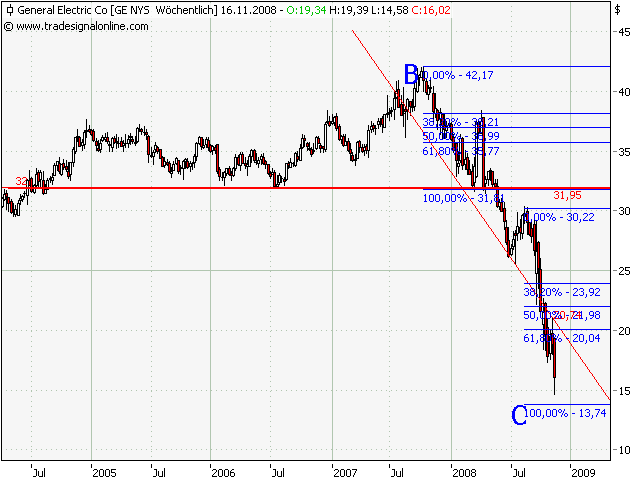Im US-Leitindex Dow Jones war General Electric (GE) der größte Wochengewinner. Der Wert legte über 8% zu. Neue Unternehmensnachrichten gab es nicht. Vielmehr hatte GE Anfang der Woche die Gewinnerwartungen für 2009 erneut gesenkt. Aber GE gab auch bekannt, dass man an seiner Dividende festhalten will, was Value-Investoren zu Käufen animierte. Der Mischkonzern will auch in 2009 eine Dividende von 1,24 US-Dollar je Aktie zahlen, was einer Dividendenrendite von 6,8% entspricht.