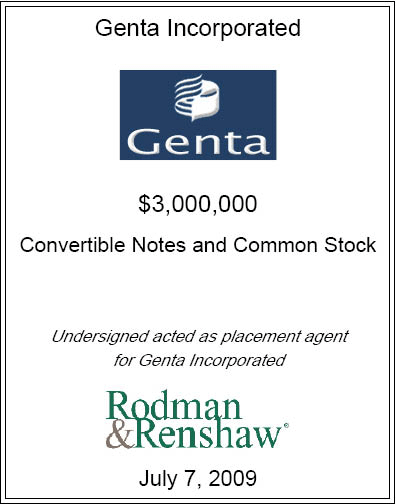 Die Meldung kam gerade ein. Genta, a biopharmac­eutical company, has reported a net loss of $43.08 million or $0.63 per share, for the second quarter of 2009, compared to a net loss of $738.4 million, or $1,004.84 per share, for the second quarter of 2008.