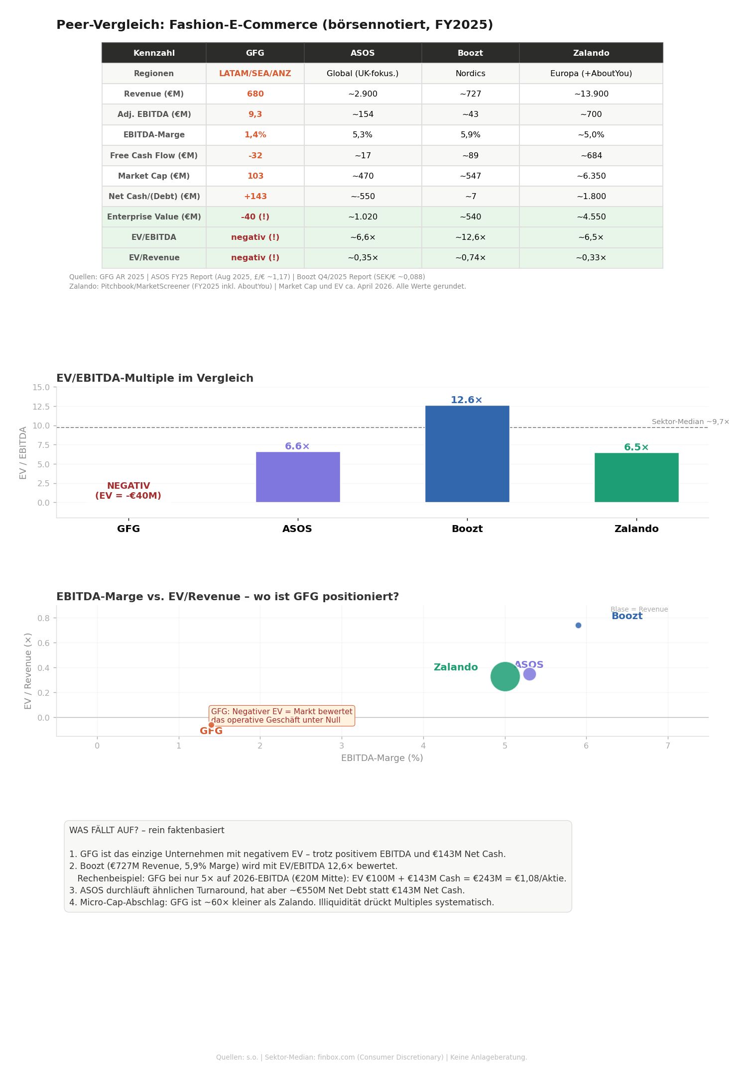Das Rechenbeispiel im Fazit-Kasten macht den Bewertungsabstand greifbar: Wenn GFG nur mit einem bescheidenen 5× EV/EBITDA auf das 2026-EBITDA der Guidance-Mitte (€20M) bewertet würde, ergäbe sich ein Equity Value von €243M. Bei 8× (wie Zalando) wären es sogar €303M.