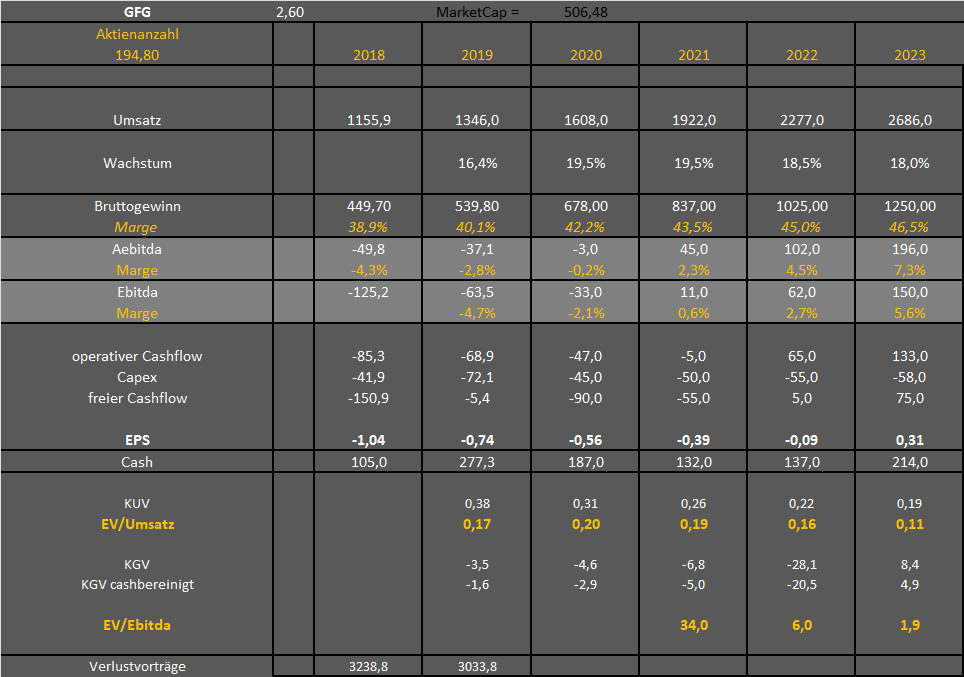 Wie gesagt, GFG ist erstmal eine Bewertungsstory. Aktuell immernoch nur EV/Umsatz von 0,20 fürs laufende und kommende Jahr.
