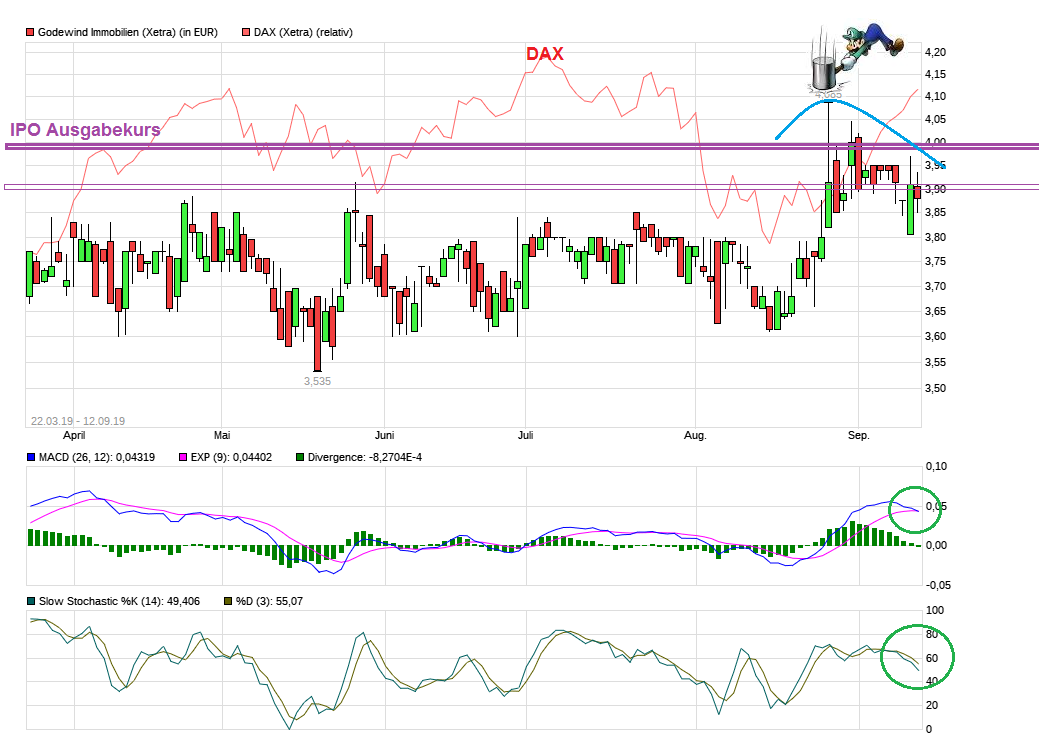 Da fliegen DAX&Co wie verrückt nach oben und Godewind bricht unter hohem Volumen um ca. 10% plötzlich ein. Doch eine KE bald vor der Tür und Wissende verkaufen ihren Bestand vorher, damit sie ihn später bei der KE wieder günstiger aufstocken können? Oder gibt es irgendwelche sonstige Bad News aktuell? Oder Rauswurf aus einem Musterdepot, wo viele hirntote Lemminge alles blind nachmachen? Oder Altaktionäre auf der Verkäuferseite?