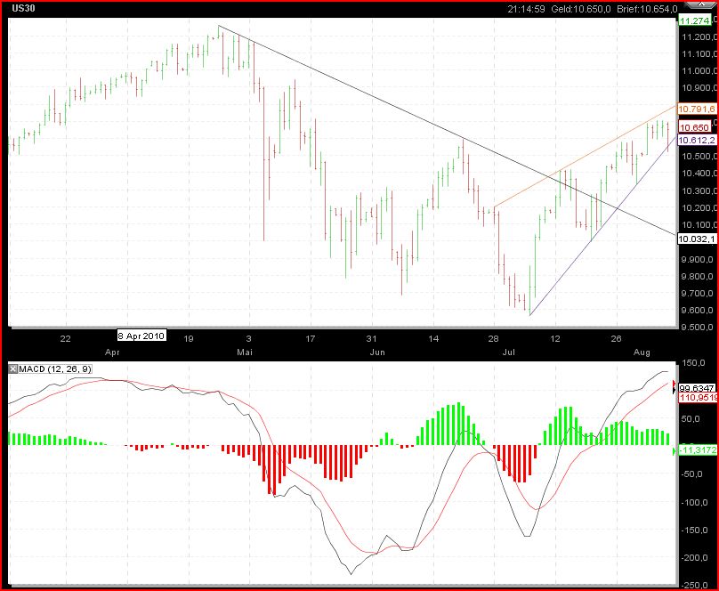 Fangen wir mal mit dem Dow an, erste Anzeichen einer Konsolidierung auf recht hohem Niveau, leider gestern gegen Handelsschluß etwas zunichte gemacht und meine Shortposi seit 10486 ist in die Verlustzohne gerutscht, nachdem ich den ganzen Nachmittag moderat im Plus war.