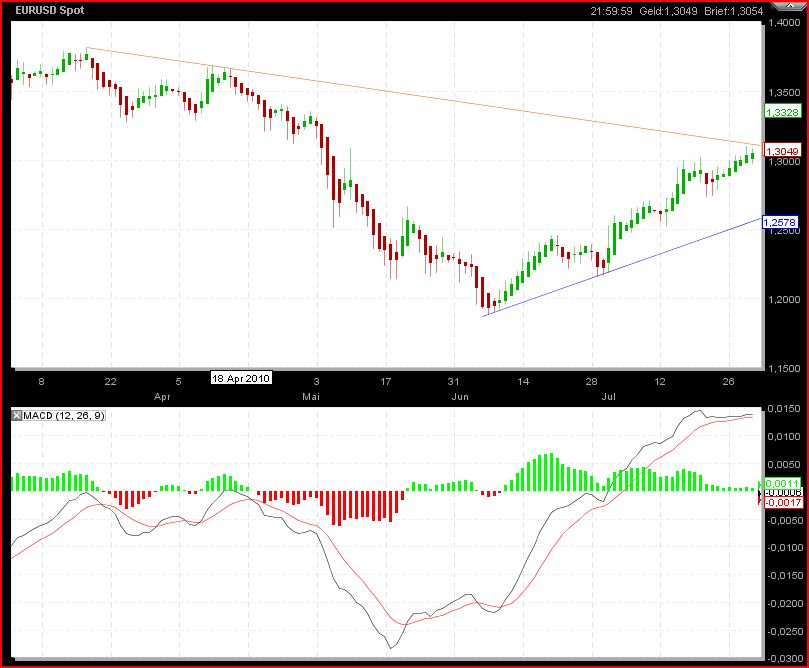 Ich bin für Euro long, hab aber heute trotzdem Gewinne eingestrichen, weil mir die ganze Sache selbst nicht ganz geheuer ist. Vielleicht gibt es noch einen Rücksetzer auf 1,3, dann bin ich wieder dabei.