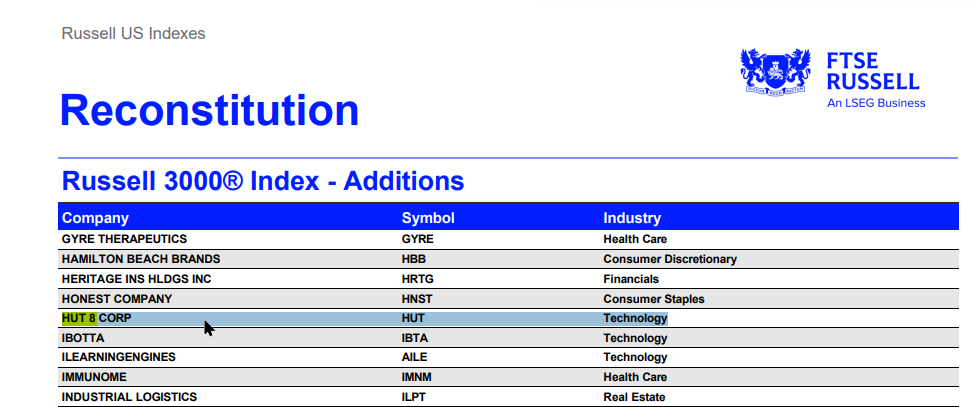 24.5.24: HUT 8 Mining Corp Russell 3000 Index