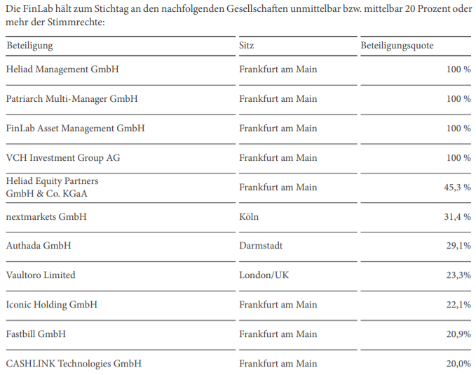 dazu passt die heutige mitteilung, dass Bernd Förtsch seine beteiligung an der FinLab AG, der muttergesellschaft der HELIAD EQUITY PARTNERS GMBH & CO. KGAA, ausgebaut (die FinLab-anteile von Christian Angermayer und der Apeiron Investment Ltd., dem Family Office von Angermayer, übernommen) hat und nun deutlich über 50% an FinLab hält
