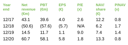 HELIADs Nettogewinn stieg von 11,3 Mio. im Geschäftsjahr 2019 auf 57,3 Mio. im Geschäftsjahr 2020, getragen von einem Neubewertungsgewinn von netto 50,9 Mio. und einem Veräußerungsgewinn von netto 9,4 Mio., die beide weitgehend mit der größten Portfoliobeteiligung, flatexDEGIRO, zusammenhängen. Dies führte zu einem Anstieg auch des Nettoinventarwerts (NAV) der HELIAD auf 13,28 je Aktie, ein Anstieg von 80% gegenüber dem Vorjahr. HELIAD zahlt der Heliad Management GmbH (ihrem Investment-Manager [und persönlich haftende Gesellschafterin (Komplementärin) der KGaA]) im Geschäftsjahr 2021 eine höhere Verwaltungsgebühr (ca. 3,2 Mio. nach unseren Schätzungen) und eine Performancegebühr für die realisierten Gewinne (ca. 3,0 Mio., basierend auf unserem Gespräch mit der Verwaltung). Wie für das Geschäftsjahr 2019 schlägt Heliad Management vor, für das Geschäftsjahr 2020 keine Dividende aus dem HELIAD-Ergebnis zu zahlen.