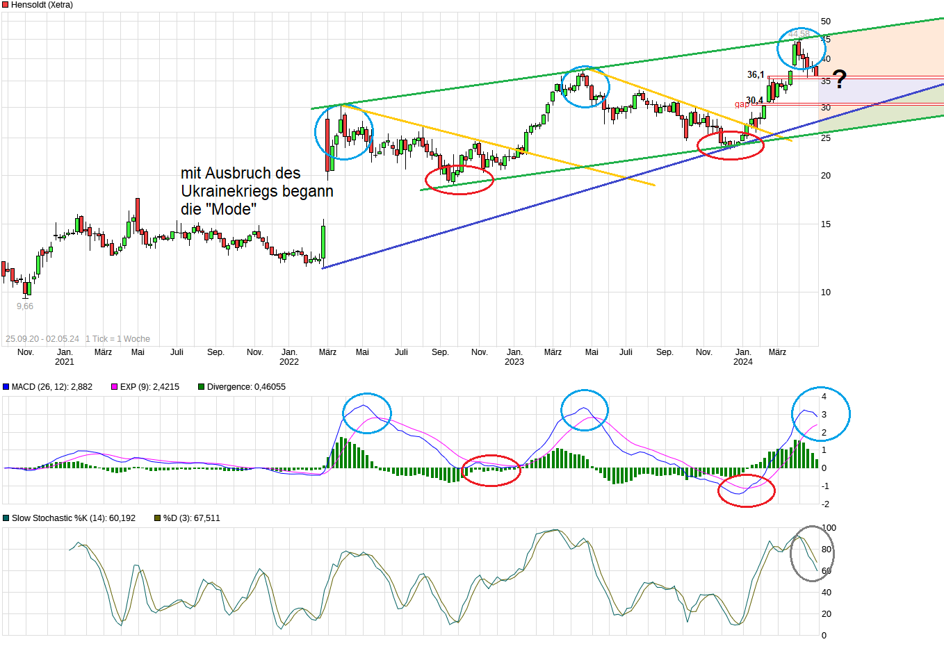 Ohne den Krieg in der Ukraine stünde man vermutlich eher im Bereich 30 Euro oder tiefer. Der Ausbruch des Ukraine-Krieges hat die Aktie emotional zu weit nach oben getrieben. Was passiert dann am Ende des Krieges? Von daher wird es jetzt spannend werden, ob der Markt sowas schon antizipieren will, d.h. die Kurse wieder in Richtung der Tiefs vom Mitte April/Anfang Mai gehen werden. Schauen wir also mal wie sich die Dinge politisch wirklich weiter entwickeln.