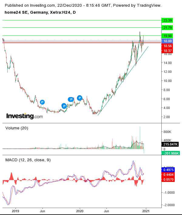 Chart Unabhängig­ von der Bewertung,­ die ich sehr niedrig finde, sieht der Chart von Home24 eher so aus, als müßte erst noch ein Boden ausgebilde­t werden, bevor es wieder nennenswer­t nach oben gehen kann.
