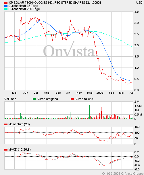 ICP Solar scheint auch einer der vielen Werte zu sein, die von mindestens­ dem investoral­ert gepuscht worden sind, aber eigentlich­ ohne Substanz sind wenn man sich mal die Umsatz- und Gewinnentw­icklung der letzten Quartale ansieht.