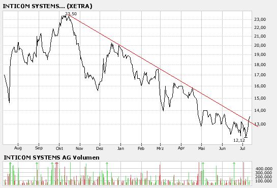 Nachdem die Inticom-Aktie (Empf.-Kurs 12,20 Euro) gestern kurz nach der Markteröffnung bereits für 13,60 Euro gehandelt worden sei, sei sie im schwachen Marktumfeld zunächst wieder zurückgefallen.