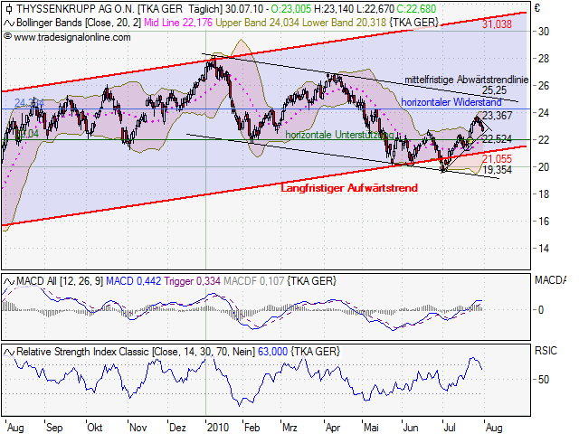 Mal etwas für die Mittel-bis Langfristigen. Charttechnisch gesehen sieht es mittelfristig nicht so ,,gut`` aus. Momentan befindet sich Thyssenkrupp in einem mittelfristigen Abwärtstrendkanal. Der lanfristige Trendkanal ist weiterhin in takt. Eine Kurzfristige Konsolidierung war überfällig! Aber schaut euch mal den RSI Indikator an: Zeichen für Überkauft. Also es wird wohl erst weiter runter gehen. (hängt natürlich auch vom Gesamtmarkt ab, aber wir befinden uns im Dax weiterhin in einer Seitwärtsrange). Das Gap bei ThyssenKrupp, welches bei 22€ liegt, wird geschlossen werden, da bin ich mir ziemlich sicher! In diesem Bereich gibt es auch wieder gute Einstiegsmöglichkeiten. Die wichtigeste Hürde (mittelfristig) ist der Mittelfristige Abwärtstrend!
