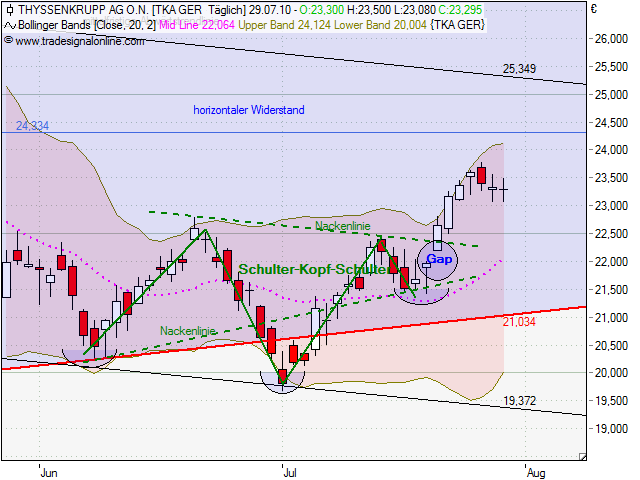 Charttechnik ist nicht alles und wenn du meinst erst bei 22 einsteigen zu wollen, dann brauchst du gute Nerven, denn der Kurs wird m.M.n weiter steigen, da Thyssen viel Nachholpotenzial hat und so schnell nicht um über 8% fällt.