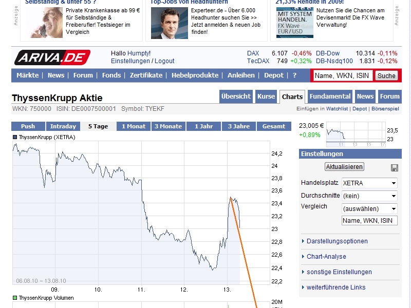 Eins ist klar. Geht der Dax runter geht auch Thyssen runter. War schon immer so und wird auch jetzt wieder so sein. Und da der Dax in den letzen Monaten immer nur auf der selben höhe pendelt, denke ich das Thyssen bis 22,5 euro höchsten fallen wird und dann wieder nach oben geht. Ich steige erst mal aus, nimm meine Gewinne mit und warte darauf, dass der Dax wieder einen positiven Trend hat. Solange nur Deutschland boomt, hilft das wenig. USA, China.... müssen erstmal wieder positives berichten, dann wirds auch mitm Dax wieder.... Ist derzeit relativ nervig. Da steigen die Kurse mal wieder und kommen letzen Endes genau da wieder an wo es begonnen hat.