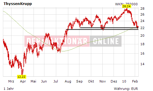 Im Nachhinein betrachtet haben sich die Unterstützungen bei ThyssenKrupp als nachhaltig und stabil erwiesen. Da wäre zum einen die horizontale Linie bei 21,68 Euro zu nennen, die aus dem Zwischenhoch im Juli 2009 resultiert. Ferner wären dies die Marke von 22 Euro sowie die 200-Tage-Linie, die derzeit bei 22,22 Euro verläuft.