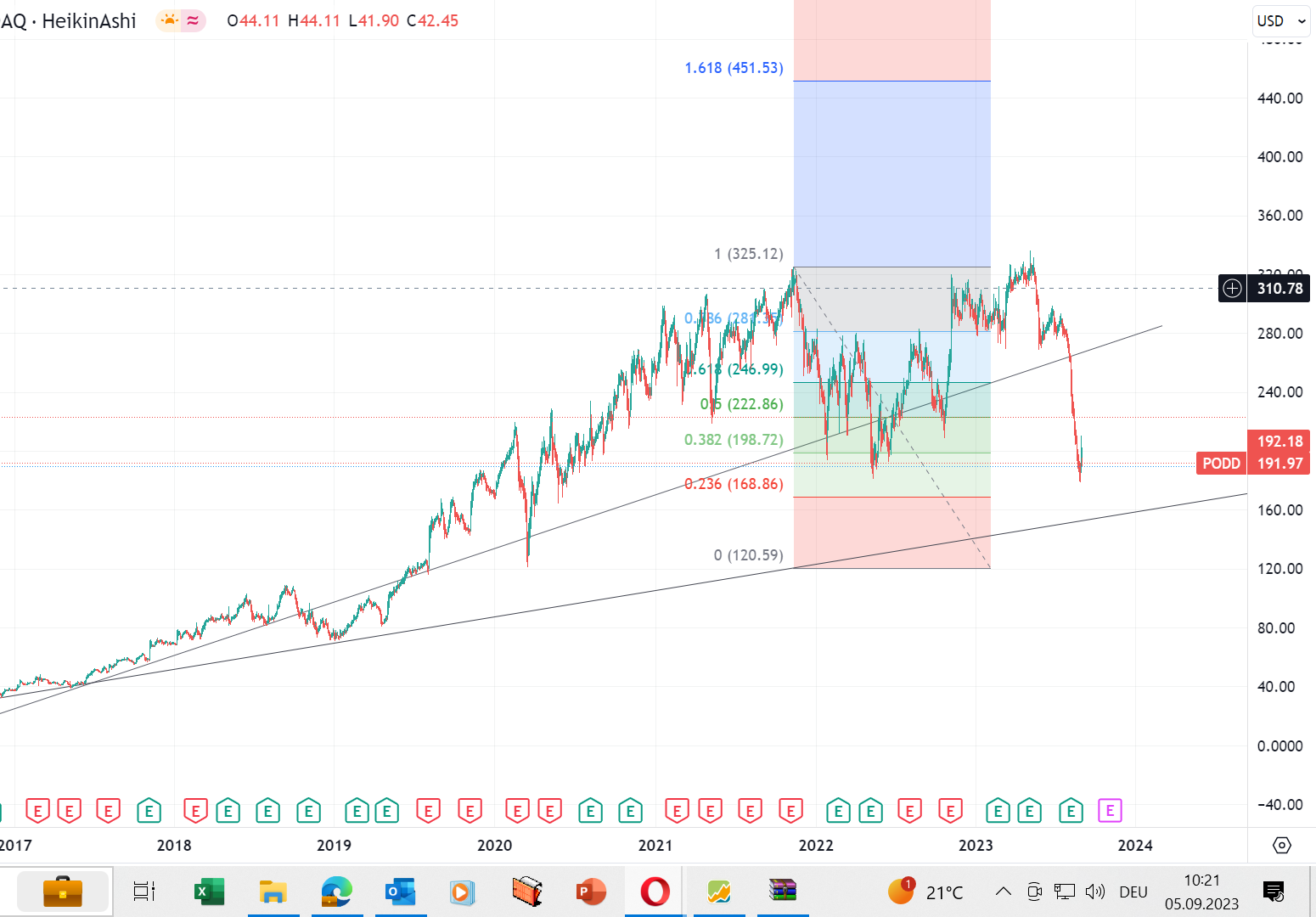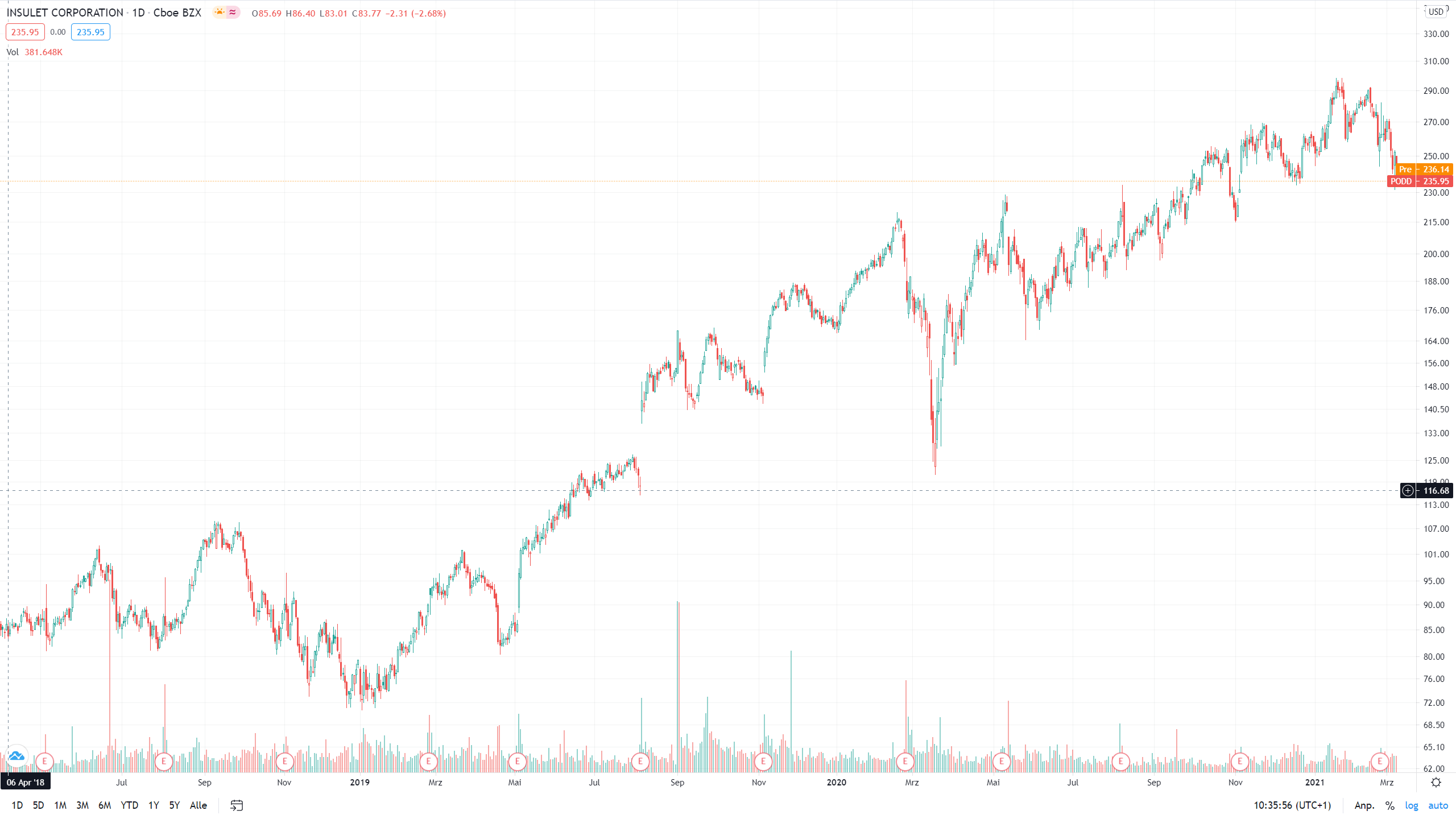 in den Charts von Dexcom, tandem diabetes und von Insulet liegt eine aufsteigende, mögliche Abprallkante exakt 44 - 45% unter den heutigen Tageskursen.
