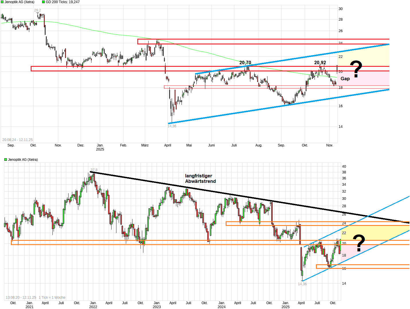 Die letzten Wochen war man ja hier bei der Aktie weiter sehr zauderlich und unsicher, ob die Zahlen reichen könnten. Parallel hat man aber schon gesehen wie andere ähnlich verprügelte Tech Werte aus dem Chipssektor anzogen (siehe Aixtron oder Suess ). Und auch Großkunden wie ASML haben schon seit einiger Zeit zugelegt. Es wäre also hier bei Jenoptik Nachholbedarf beim Kurs. Entsprechend war das heute eine Erleichterung. Ähnlich wie jüngst bei der Aktie der Deutschen Post hat man dann auch hier jetzt einen Freudenhüpfer gemacht. O.k., ein Eröffnungsgap ist nicht immer so ideal, da es oft geschlossen wird in der Folgezeit. Aber es gibt ja nicht nur Common Gaps, sondern auch Breakaway Gaps, die nicht mehr geschlossen werden und von fundamentalen Dingen angetrieben wurden. Hoffen wir mal Letzteres wird hier eintreffen. Der Kurs steht jetzt wieder an der altbekannten Widerstandszone im Bereich 20,50/21,00. Von daher mal abwarten, ob es jetzt gelingt sich darüber zu etablieren und auch einige LV zum covern zu bewegen. Dann wäre der Weg nach oben ein ganzes Stück wieder frei. Ich denke man ist mit der weiteren Prognose bewußt eher konservativ geblieben, damit man bei den nächsten Zahlen auch da leichter wieder für positive Überraschung sorgen könnte.