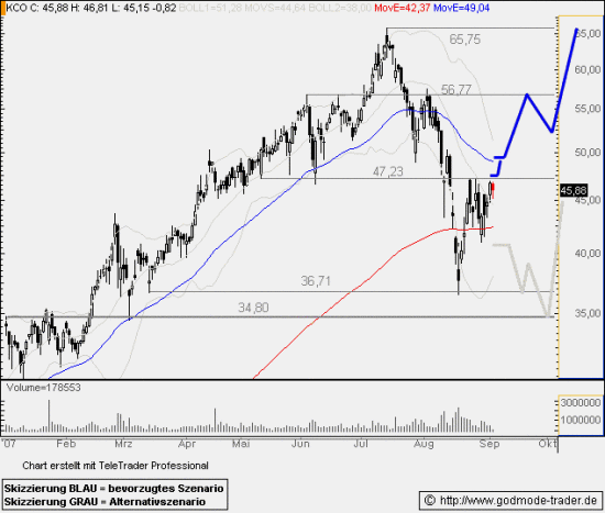 Rückblick: Die KLÖCKNER markierte nach einer mittelfristigen Kursrallye das Allzeithoch bei 65,75 Euro Mitte Juli 2007 und startete eine heftige Abwärtskorrektur. Knapp oberhalb der Horizontalunterstützung bei 34,80 Euro drehte sie im August wieder nach oben und lief bis an die Widerstandsmarke bei 47,23 Euro heran. Knapp unterhalb dieser nun als BUY Trigger definierten Marke pendelt sie nun seitwärts. Das kurzfristige Chartbild ist neutral zu werten, so lange die Aktie zwischen den beiden exp. GDL (EMA200 und EMA50) notiert.