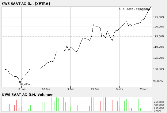 KLar gibt es größere und erfolgreichere Unternehmen in der Branche aber KWS ist aus meiner Sicht eine echte Perle. Der Forschungsetat ist enorm und sie wachsen sehr solide. Langfristig gibt es natürlich den Knick bei den Zuckerrüben zu verdauen. Das dürfte aber gerade mit dem Zusatzgeschaft Biokraftstoffe gut gelingen. Die Bilanz von KWS ist Blitzblank und Dividenden werden auch recht gut gezalht. Allerdings ist hier durch den starken Kursanstieg die Rendite eher bescheiden. Dazu kommt eine mitlerweile ganz ordentliche Bewertung. Aber KWS war schon immer hoch bewertet. Aussagen zum KGV sind im Moment schwer zu machen. Wenn der Ölpreis allerdings weiter auf dem jetzigen Niveau bleibt oder vielleicht noch steigt wird KWS ganz ordentlich profitieren.