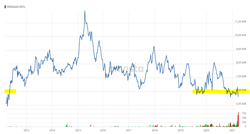 Hengan ist seit 2015 im Abwärtstrend und wenn man sich den Gesamtchart anschaut, so ist da immer noch Luft nach unten. Anders als TheEuropeanView im Titel dieses ausführlichen Artikels hier am 19.4.2021 andeutete bin ich allerdings nicht der Meinung, daß Hengan eine "chinesische Wirecard" ist oder wird.