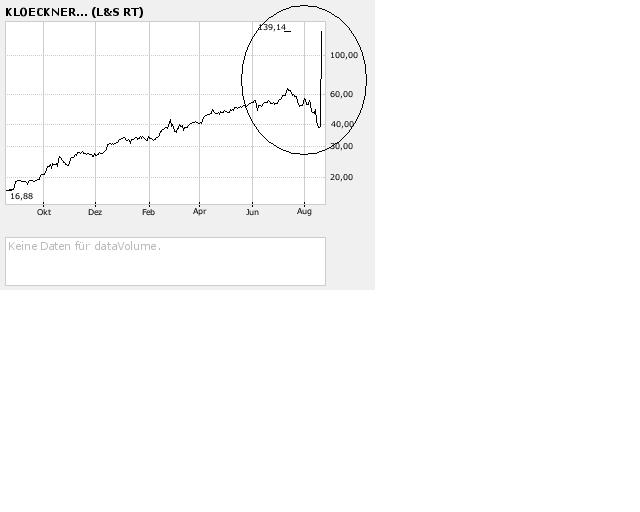 Ein trügerisches Signal hätte man bei der Klöckner z.B. Anfang August haben können. Es ging steil bergab bis 53€, der Tiefpunkt war scheinbar erreicht. Die Aktie hat sich wieder auf 56€ erholt. Das hätte eigentlich ein optimaler Kaufzeitpunkt sein können. Wars aber nicht, es ging nochmal bergab. Der nächste Zeitpunkt wäre dann 47€ gewesen, war aber auch nichts.