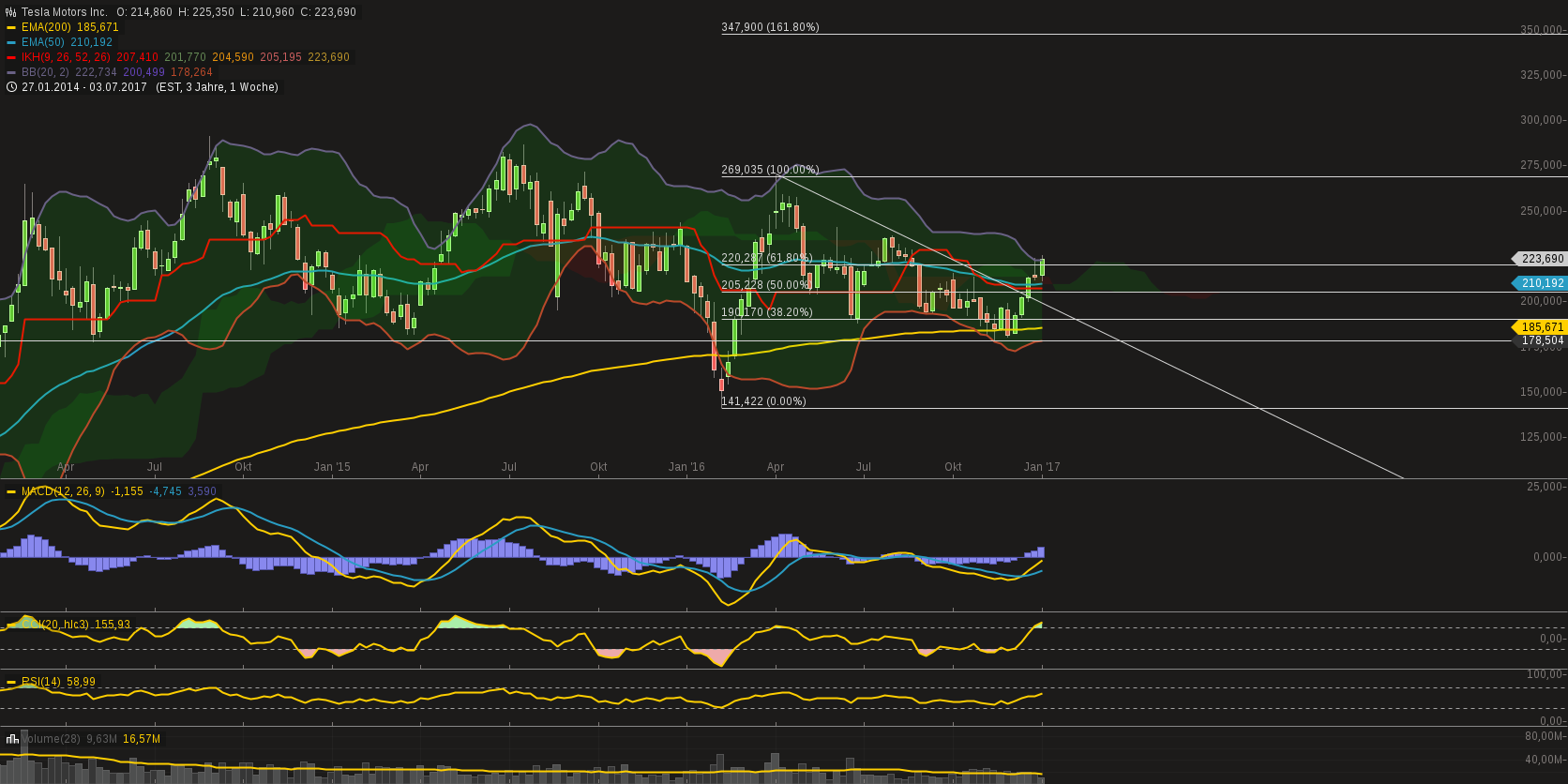 Im besten Fall kommt Model 3 pünktlich auf den Markt, Verzögerungen könnten Tesla schnell in die Bredouille bringen. Im Laufe des nächsten Jahres werden zudem eher die etablierten Hersteller mit Neuvorstellungen/Ankündigungen von sich reden machen. Das Risiko, dass die Aufholjagd der Platzhirsche, die vermutlich auf absehbare Zeit keine Gewinne im E-Bereich einplanen, über Jahre hinweg die Margen drückt oder sogar zu einem Überangebot mit "E-Carmageddon" führt, steigt. Somit scheint es mir insgesamt unwahrscheinlich, dass die derzeitigen Kurse nicht mehr unterboten werden.