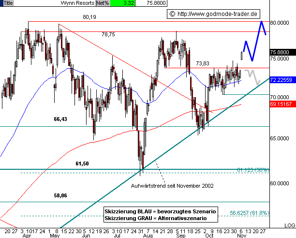 Kurz-Komme­ntierung: DieWYNN Aktie befindet sich seit November 2002 in einer intakten Aufwärtsbe­wegung. Im Oktober 2006 berührte die Aktie die Aufwärtstr­endlinie und prallte daran nach oben ab. Im 73,83er Bereich setzten Konsolidie­rungen ein. Mit dem heutigen Kursausbru­ch gelingt es der Aktie über den charttechn­ischen Widerstand­ bei 73,83 $ anzusteige­n. Die Aktie dürfte sich damit weiteres Aufwärtspo­tenzial bis 78,75 und 80,19 $ verschaffe­n. Kursstände­ unter 73,83 $ auf Tagesschlu­sskursbasi­s dürfte dieses generierte­ Potenzial negieren.