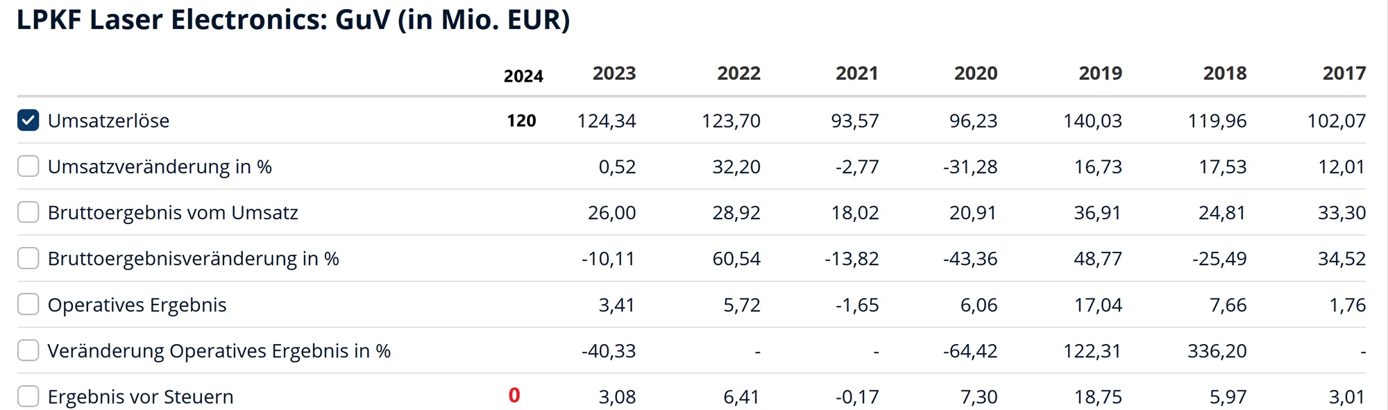 Nachdem LPKF als einziges Unternehmen, von allen denen ich an der Börse folge, im Jahr 2025 keinelei Meldungen von sich gegeben hat, gehe ich davon aus, dass die Geschäfte, wie bei vielen im Maschinenbau, stark rückläufig sein werden. Es würde mich nicht wundern wenn der Umsatz auf 100 € sinken wird, wenn nicht gar mehr (Sieh dir unten die Zahlenreihe an, das hat hier Tradition).