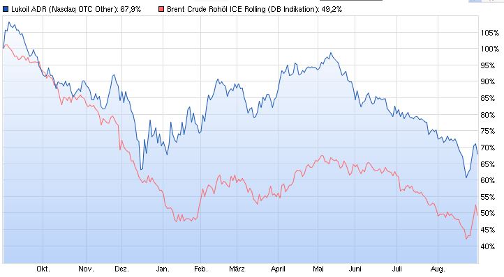 Auf Jahressich­t hat sich Lukoil gegenüber dem Brent sogar gut behauptet und deutlich weniger verloren. Am Chart sieht man schön, dass sie seit Februar 2015 einigermaß­en gleich laufen.