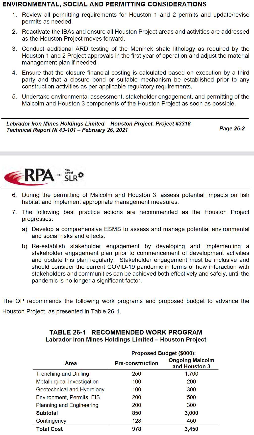 (ii)Complete a trade-off study on use of LIM’s Redmond property rail right-of-way for the Houston Project’s rail loading operations. Although a longer truck haul is required (approximately 1.5 km greater), the Redmond property rail right-of-way was formerly used for loading iron ore trains (by IOC) and includes an existing rail bed with a rail loop at the end to turnaround, versus the current proposed Houston rail siding operation, which requires the train to be split multiple times.