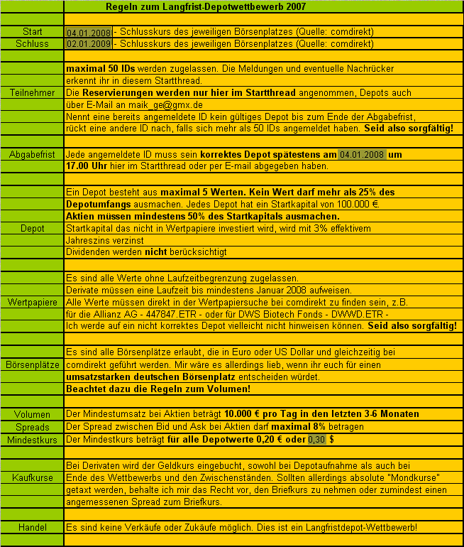 Die Regeln des Vergleichs bleiben die Gleichen wie 2007, und sie sind alle in der angehängten Graphik abgebildet. Die IDs, die also an diesem Depotvergleich teilnehmen wollen, sollten sich diese Regeln genau durchlesen! Unter Umständen kann ich darauf nicht frühzeitig genug noch einmal hinweisen, falls sich bei jemandem Fehler eingeschlichen haben. Anmeldungen sind ausdrücklich nur hier im Thread möglich!!!